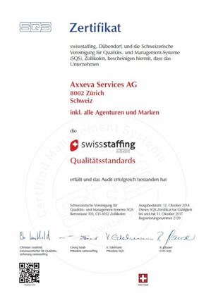 Im Rahmen der Überprüfung der Qualitätsstandards wurden sämtliche Agenturen der Axxeva Services AG von der Zertifizierungsstelle swissstaffing SQS erneut mit dem Zertifikat für die Erfüllung der Qualitätsstandards ausgezeichnet. Alle Agenturen der Axxeva Services AG erfüllen somit die Voraussetzungen, welche der Verband an uns stellt. Weitere Informationen zu den Standards von swissstaffing erhalten sie unter der folgenden Adresse. |